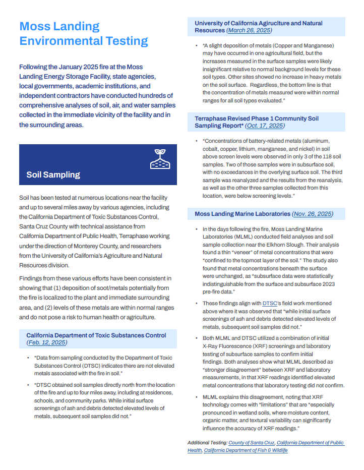 Vistra began initial air monitoring on site at approximately 4 p.m. on Jan. 16 when the fire was first detected. The U.S. EPA arrived on site at approximately 2 a.m. on Jan. 17 and began their testing. A leading independent environmental firm, CTEH, arrived at 5 a.m. on Jan. 17 and began conducting extensive air quality monitoring at the Moss Landing site and in the community. CTEH mobile air monitoring personnel sampled over 100 locations, testing for seven air constituents specific to this type of fire. This was complemented by nine stationary monitoring units established by the U.S. EPA.